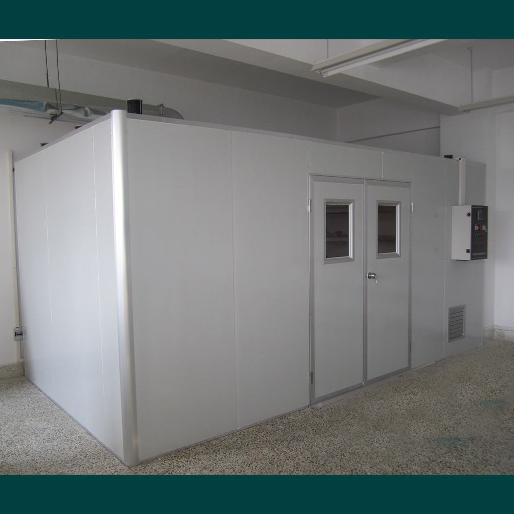 房體結構:高溫老化房房體結構一般采用保溫板(雙面彩色鋼板,中間必須是巖棉)在現場拼裝而成,房間尺寸均根據客戶要求設計。整個房間外表美觀,結構牢固,同時安裝方便快捷,施工期短。在房間墻上,根據需要可設置觀察窗,方便在室外觀察到室內產品測試情況。在墻上還配有不同電壓的插座,以滿足產品老化測試時的需要。
