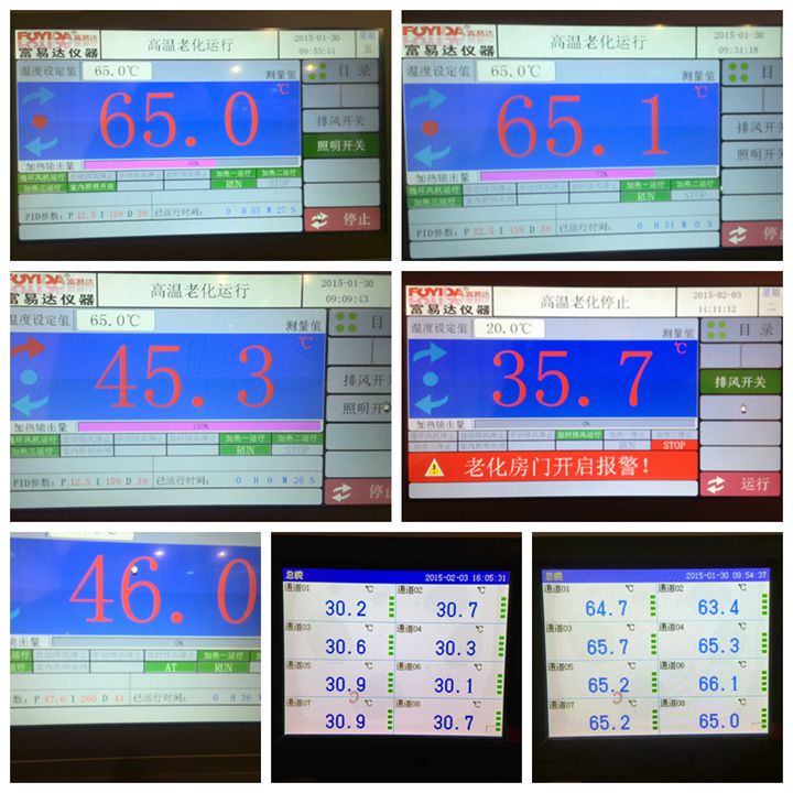 b、控制部件:觸摸屏 + PLC + 溫度模塊 + 控制軟件 c、遠程溫度控制(溫度監控或者停機)(不含溫度記錄儀的傳感器狀態) 8.20、溫度控制方式: a、PID為控制核心,通過過繼電器實現自動控制功能 b、采用獨立溫度超溫保護控制系統 c、時間單獨控制 8.21、溫度檢測: a、室內1點溫度檢測、1點超溫保護檢測、8點溫度監控(整個老化房共布置10個溫度測試點) b、排風采用獨立手動操作,以防止因外部原因造成排風系統癱瘓 |